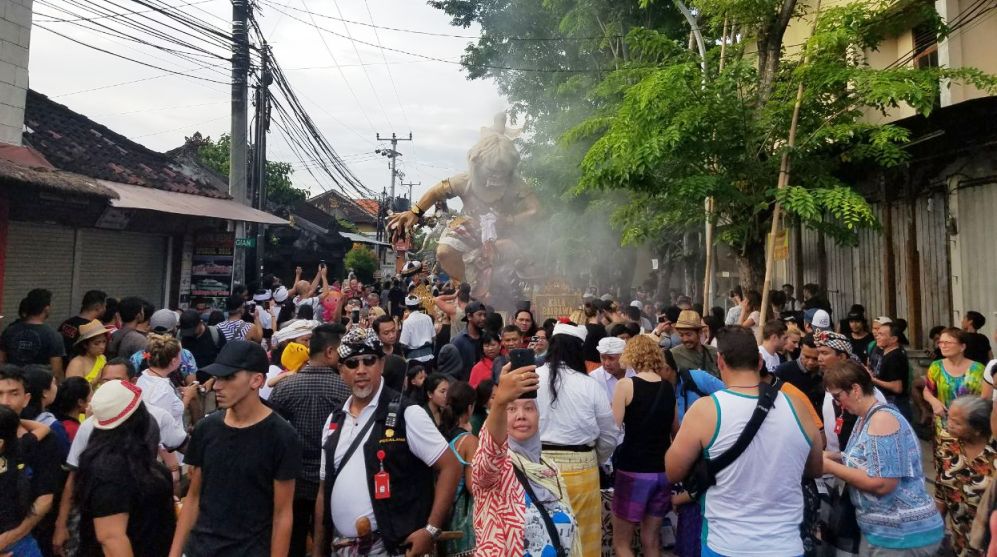 Pawai ogoh-ogoh menarik minat para turis, baik asing maupun domestik yang berada di Kuta. Mereka berswafoto dengan ogoh-ogoh yang dipamerkan di Jalan Legian.