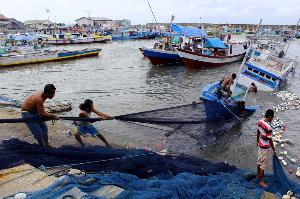 Nelayan menarik pukat di Pelabuhan Pelelangan Ikan (PPI) Kelurahan Fatubesi, Kupang, NTT, Minggu 4 Januari 2015, MI - Palce Amalo (Antara)