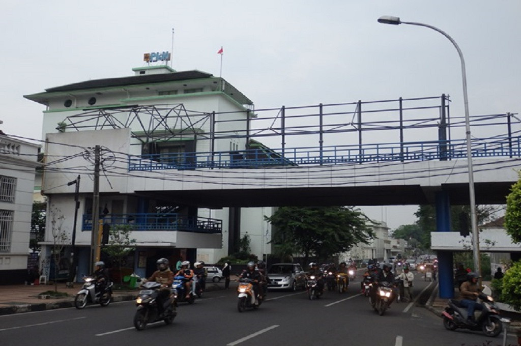 Jembatan penyeberangan di Jalan Asia Afrika diperbaiki jelang peringatan KAA di Bandung, sumber foto: Metrotvnews.com/ Roni Kurniawan