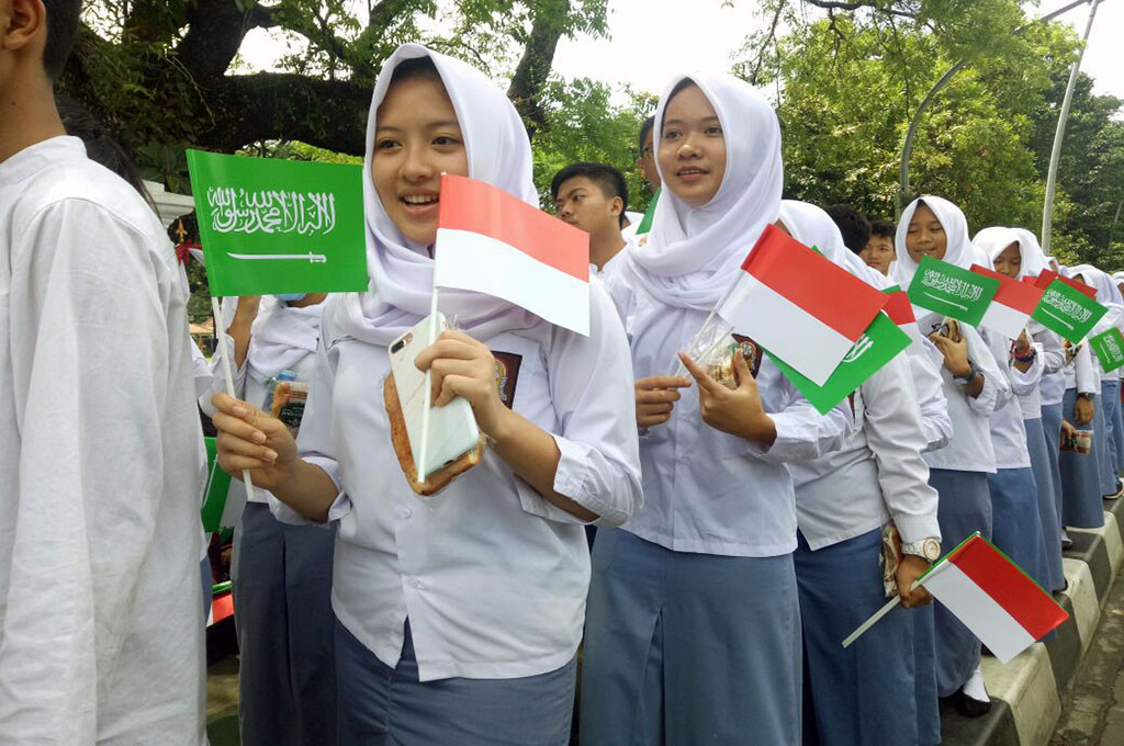 Seluruh pelajar dibekali dua bendera, yakni Indonesia dan Arab Saudi berwarna hijau dengan tulisan kalimat Allah. Cuaca panas tidak menyurutkan semangat mereka berdiri di sepanjang jalan.