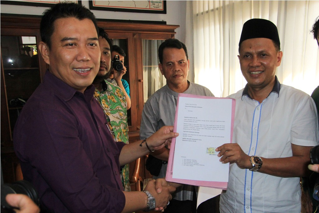 Bakal calon wakil bupati Rastawiguna (kanan) menyerahkan surat pengunduran diri kepada ketua KPUD Indramayu Hadi Ramdlan (kiri) di Kantor KPUD Indramayu, Jawa Barat, Sabtu (22/8). Foto: Antara/Dedhez Anggara (Nurul Hidayah)