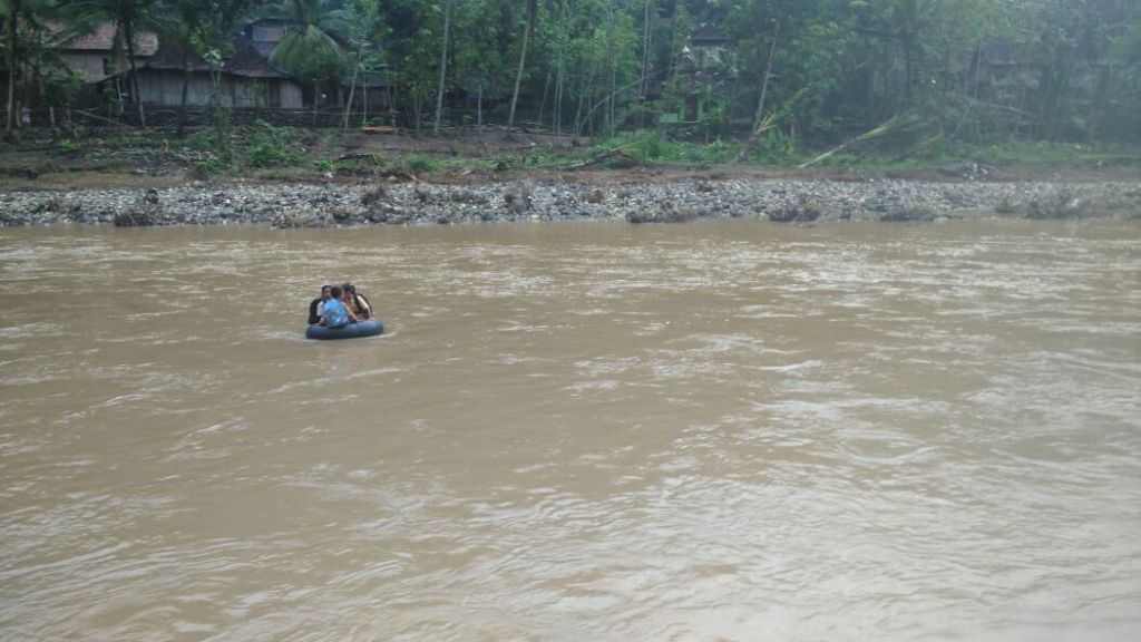 Jembatan Hanyut Siswa SD Terpaksa Seberangi Sungai Pakai Ban