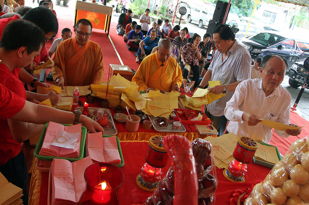 Ritual yang dipimpin biksu dari Jakarta, yakni Sin Chen dan Darmanto. Prosesi acara dimulai dengan sembahyang ucapan terimakasih kepada Tuhan dan Dewa yang sudah melindungi umatnya dalam satu tahun. Pemimpin ritual membacakan doa atau mantra diikuti oleh umat yang cara penyampaiannya dengan dilantunkan.