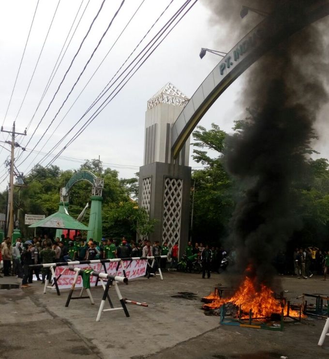Puluhan karyawan ini sempat melampiaskan kekesalan dengan membakar ban bekas di depan pintu gerbang perusahaan. Polisi bersama petugas pemadam kebakaran melokalisir api agar tak merembet ke pabrik.