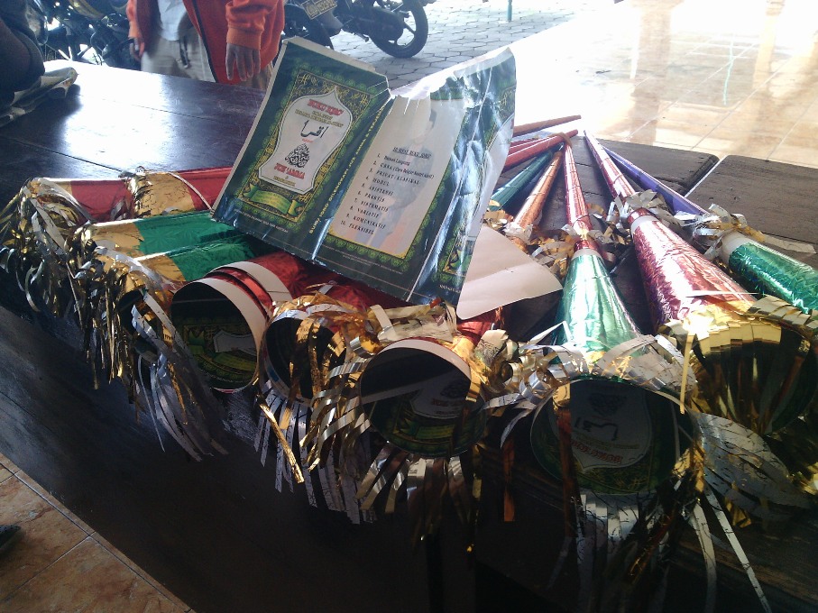 Polisi menemukan sepuluh terompet menggunakan bahan cetakan mirip sampul iqra di Kabupaten Karanganyar, Jawa Tengah. Sepuluh terompet itu ditemukan di dua tempat berbeda yakni pedangang terompet di kawasan depan Sondokoro dan Jaten, Karanganyar.