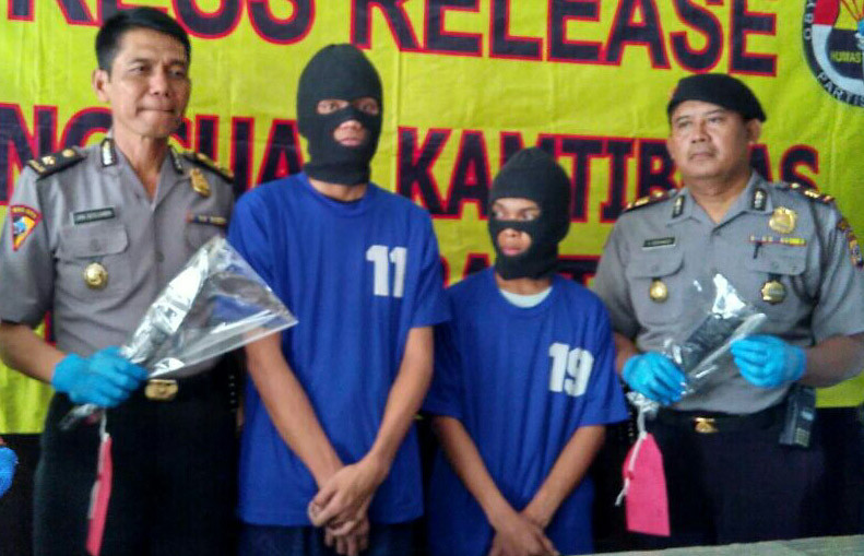Dua orang itu ditangkap saat polisi melakukan patroli menjelang tengah malam 14 Januari. Polisi menyita celurit, sangkur, dan keling. Benda-benda tersebut diduga biasa dipakai melakukan kekerasan.
