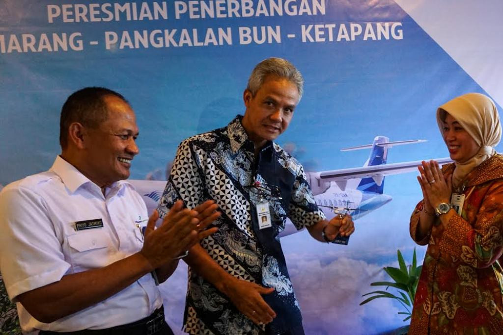 Vice Presiden Domestik Region III Jawa Bali dan Nusa Tenggara, Flora Izza (kanan), Gubernur Jawa Tengah, Ganjar Pranowo (tengah), dan General Manager Angkasa Pura I Semarang, Priyo Jatmiko (kanan), saat peresmian rute perdana Garuda Indonesia, Semarang -
