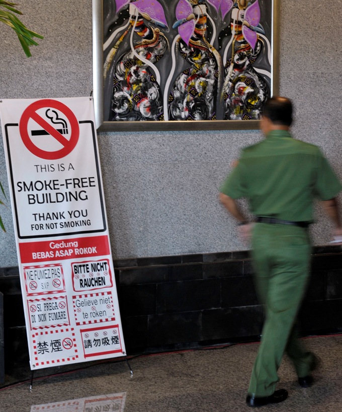 Seorang pegawai negeri sipil mengamati poster kawasan tanpa rokok dalam beberapa bahasa asing di sebuah perkantoran. (Ant/Nyoman Budhiana) (Patricia Vicka)