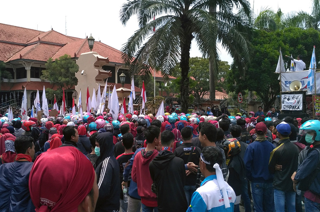 Aksi di depan Kantor Bupati Jepara diikuti oleh pekerja dari Sami Yazaki dan Parkland World Indonesia. Mereka yang ikut berunjuk rasa kebanyakan pekerja yang masuk pada shift malam.