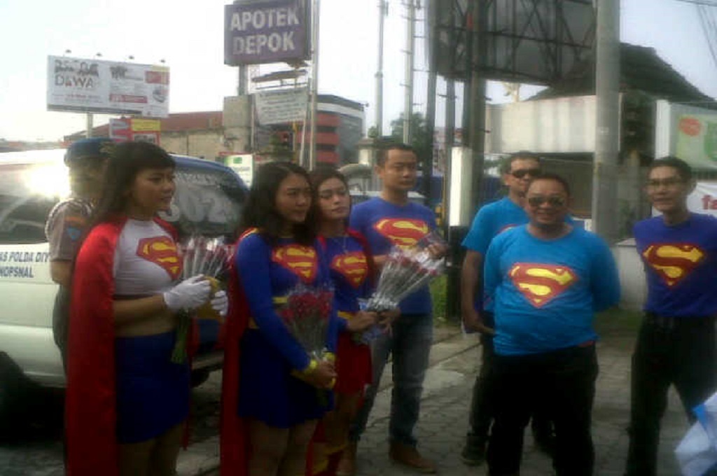 Itulah aksi perempuan anggota komunitas Superman Fans Of Indonesia. Aksi itu merupakan kerja sama dengan Polres Sleman untuk mengampayekan tertib berlalu lintas.