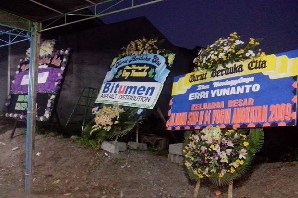 Namun, karangan bunga itu bukan bentuk suka cita. Deretan karangan bunga itu menyambut Erri yang meninggal setelah menginjakkan kakinya di Puncak Garuda. Saat hendak turun dari puncak, Sabtu 16 Mei 2015, Erri terperosok. Ia jatuh ke kawah dan meninggal.