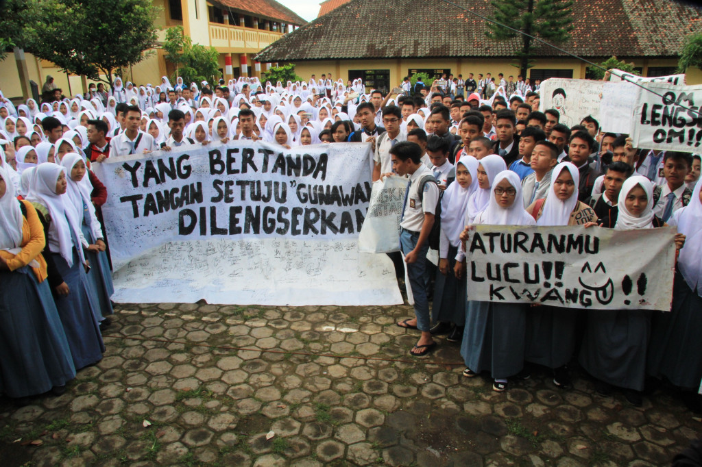 Mereka menurut. Namun, para siswa tak saja membawa perlengkapan sekolah. Sembari membawa spanduk dan poster, para siswa bersama-sama menuju lapangan sekolah.