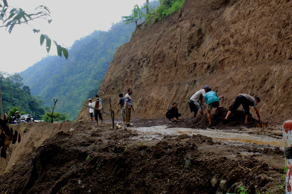 Tanah longsor di Desa Tempur, Keling, Jepara, menutup akses jalan pada 2014. Usai longsor terjadi retakan dan penurunan tanah. (Metrotvnews.com/Rhobi Shani) (Rhobi Shani)