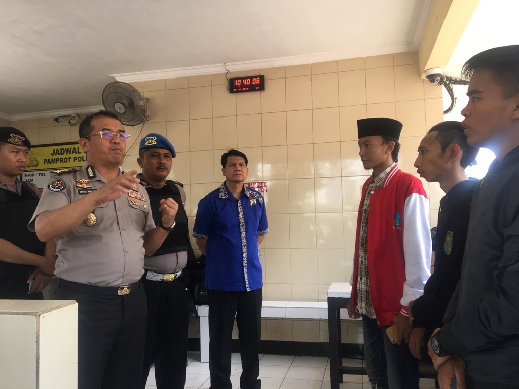 Kabid Humas Polda Jatim, Kombes Pol Frans Barung Mangera, saat menemui perwakilan demonstran di Mapolda Jatim. (Medcom.id/Amal). (Amaluddin)