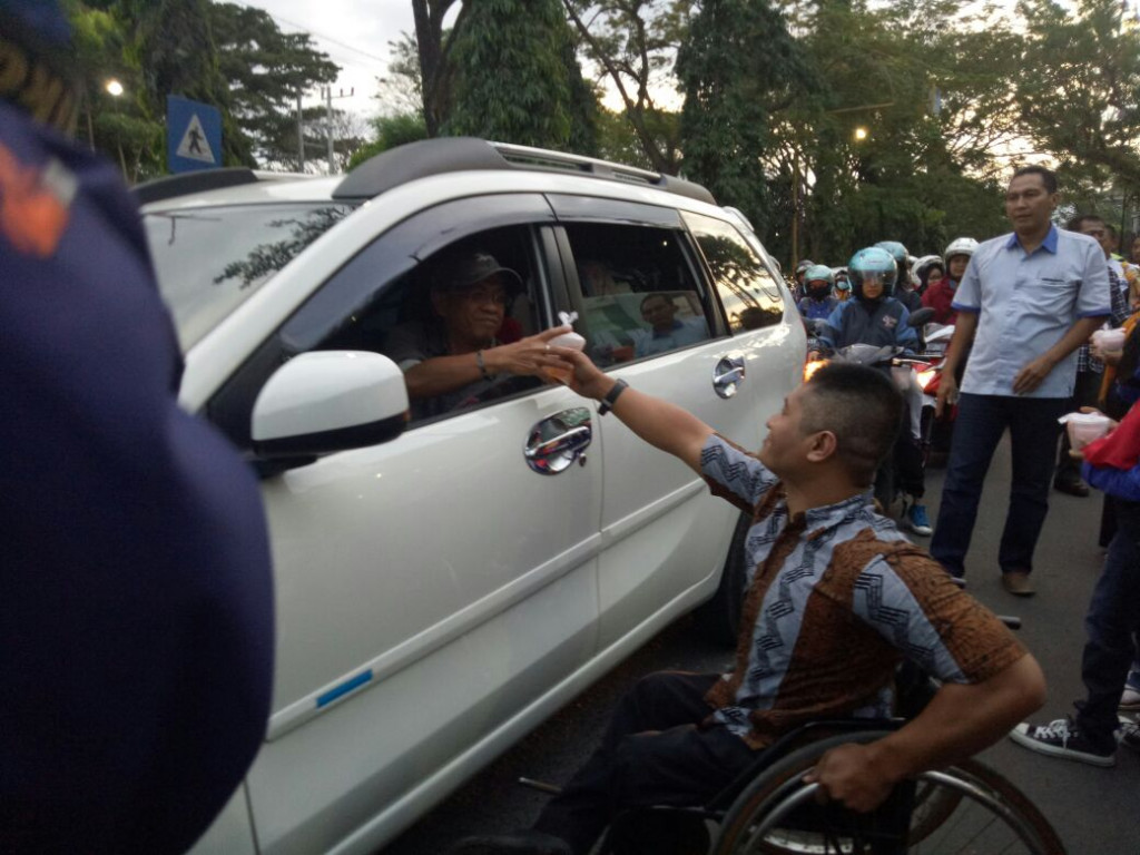 "Di sini kami diundang pihak Matos, sekaligus untuk memberi motivasi kepada masyarakat. Meskipun kami difabel tapi kami masih bisa berkegiatan sosial, " katanya disela-sela membagikan takjil.