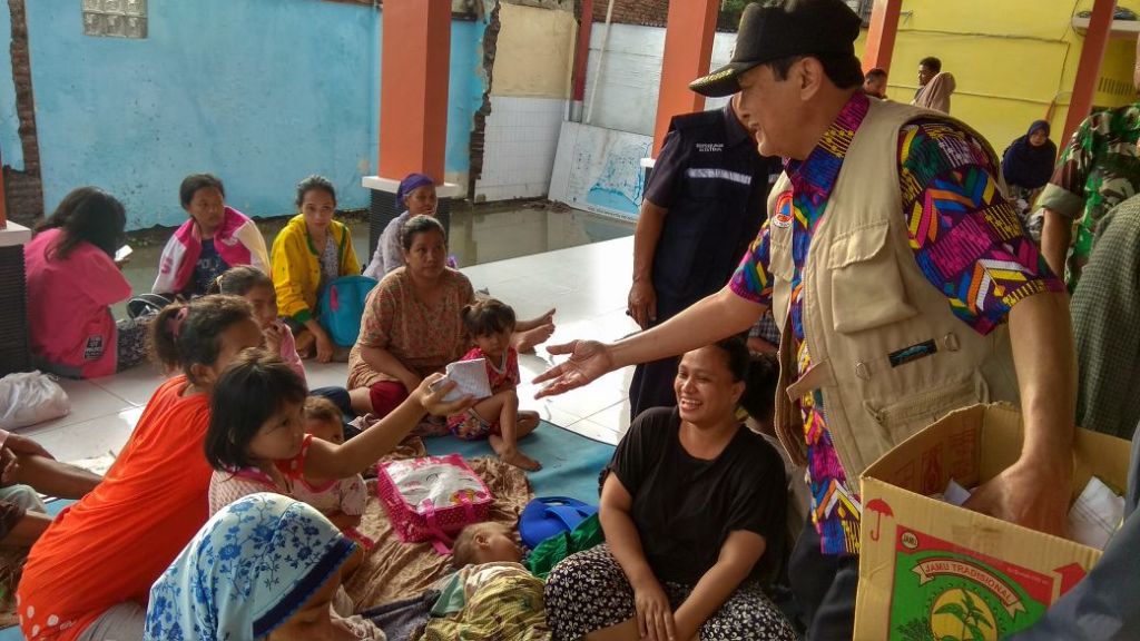 Plt Wali Kota, Nursholeh, bersama warga korban banjir di Posko Pengungsi Kantor Kecamatan Margadana, Kota Tegal, Jawa Tengah. (Medcom.id/Kuntoro Tayubi) (Kuntoro Tayubi)