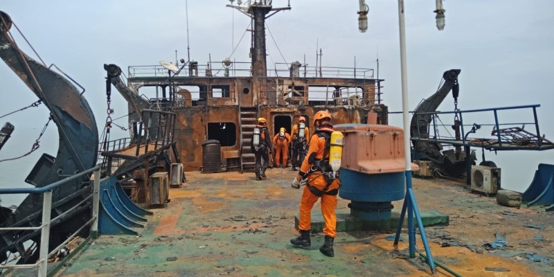 Surabaya: Tim SAR melakukan penyisiran di dalam bangkai KM Gerbang Samudera I yang terbakar di perairan Karang Jamuang, Kabupaten Gresik, Jawa Timur. Dalam penyisiran, tiga awak kapal yang hilang ditemukan dalam keadaan meninggal.
