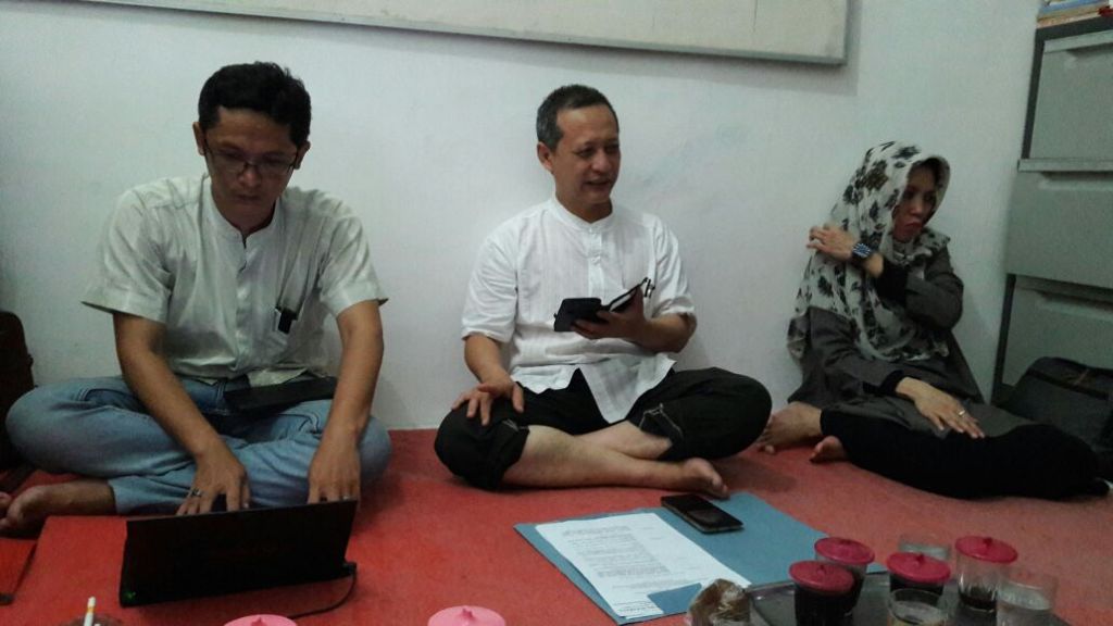 M. Fauzi Said, mantan Dekan Fisip UWKS (kemeja putih) bersama sekretaris LPBH NU Jatim, Jakfar Shodiq, di Sekretariat PWNU Jatim, Surabaya. Foto: Metrotvnews.com/Amal