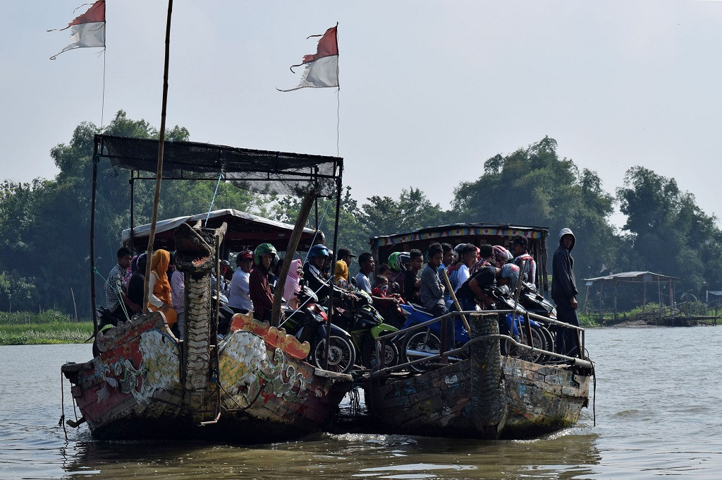 Warga menggunakan perahu untuk menyeberangi Sungai Brantas di Jombang, Ant - Syaiful Arif (Nurul Hidayat)