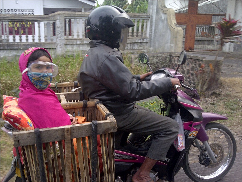 Seorang warga membonceng anak balitanya menggunakan masker untuk melindungi dari abu vulkanik Gunung Raung, di Desa Sumberarum Kecamatan Songgon, Banyuwangi, Jawa Timur, Jumat (10/7). Foto: MI/Khoirul Hamdani