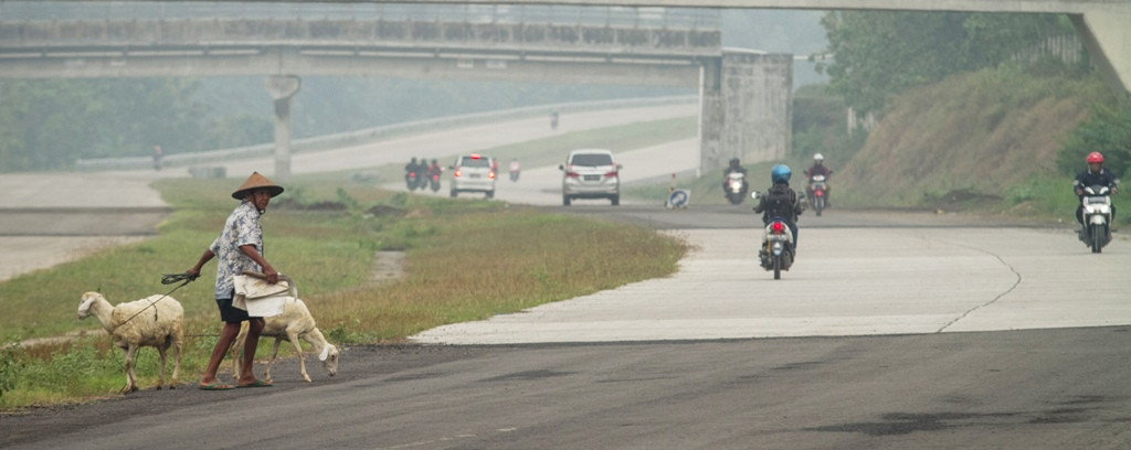 Warga menggembala kambing ternak miliknya di Tol Solo-Ngawi, Karanganyar, Jawa Tengah, Selasa (13/6). --Antara/Mohammad Ayudha ()
