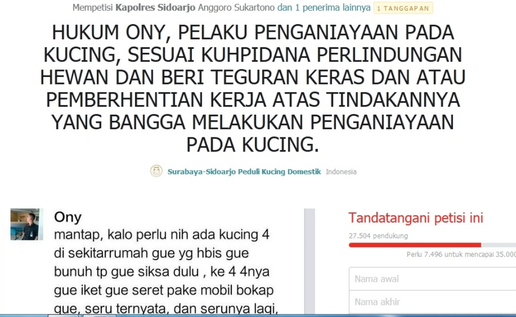 Komentar di petisi itu juga umumnya mengecam aksi pegawai sebuah bank ini yang menyeret empat kucing menggunakan mobil ayahnya. Bahkan, sejak kecil Ony mengaku sudah menyiksa ratusan kucing hingga mati.