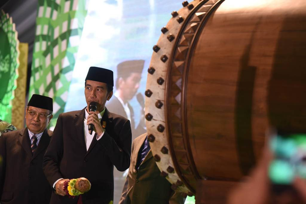 Presiden Joko Widodo (kanan) bersiap memukul beduk disaksikan Ketua PBNU Said Aqil Siradj sebagai tanda dibukanya Muktamar ke-33 Nahdlatul Ulama, di Jombang, Jawa Timur, Sabtu (1/8). Foto: Antara/Zabur Karuru