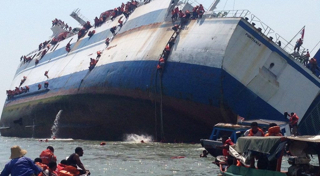 Penumpang bergelantungan di dinding kapal KM Wihan Sejahtera untuk menyelamatkan diri saat kapal akan tenggelam di Teluk Lamong, Surabaya, Jawa Timur, Senin (16/11). Foto: Antara/Polair Polda Jatim