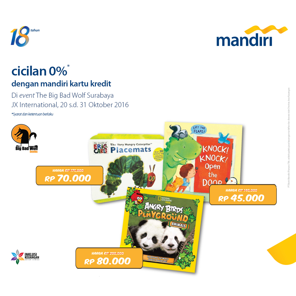 Sementara itu Bank Mandiri sebagai rekan ikut serta meramaikan Big Bad Wolf Book Sale Surabaya dengan memberikan customer experience lebih dengan penawaran tambahan diskon sebesar 20% atau cicilan 0% bagi pelanggan yang menggunakan fiestapoin, e-cash atau kartu kredit dari Bank Mandiri.