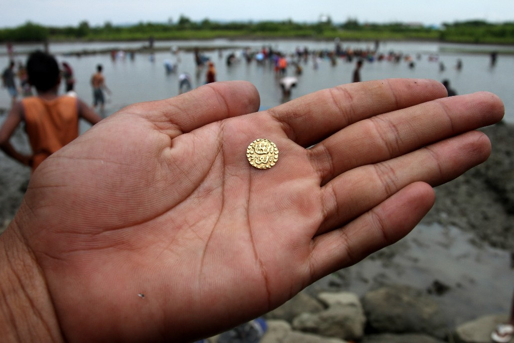 Warga memperlihatkan koin emas kuno yang ditemukannya di sungai Desa Kampung Pande, Kecamatan Kutaraja, Banda Aceh, Senin (12/11/2013). Foto: Antara/Irwansyah Putra