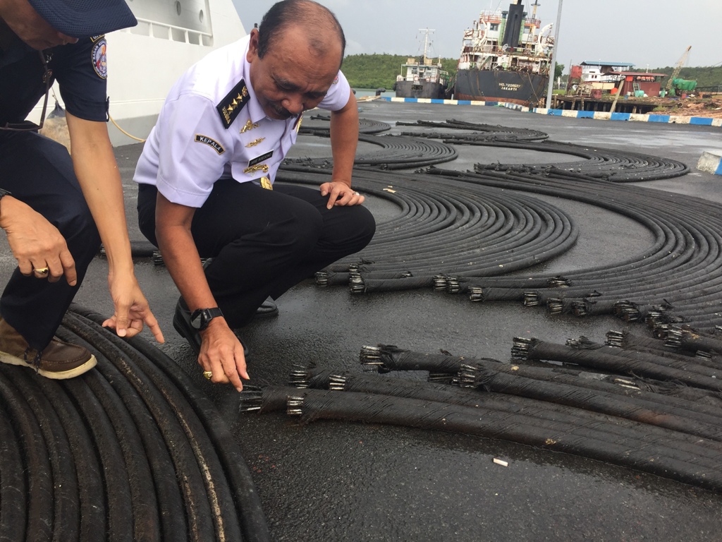 Kepala Bakamla RI Laksdya Arie Soedewo meninjau barang bukti kabel fiber optik hasil curian delapan pelaku, di Pangkalan Zona Maritim Barat, Barelang, Kota Batam, Senin, 28 Mei 2018. (Anwar Sadat Guna)