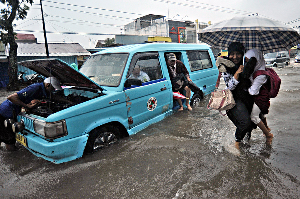 Penumpang turun dari angkot yang mogok akibat banjir di Jalan Jhoni Anwar, Lapai, Padang, Sumatera Barat -- ANT/Iggoy el Fitra (Antara)